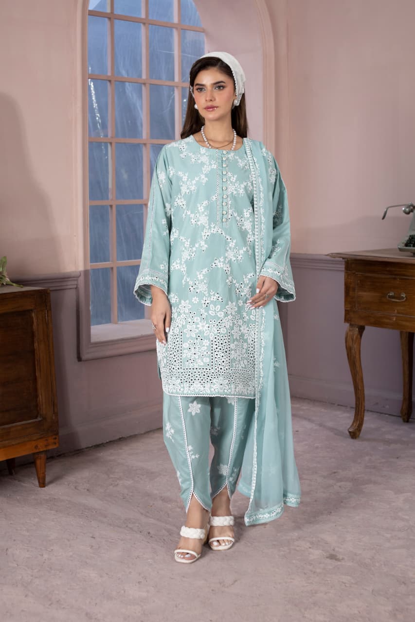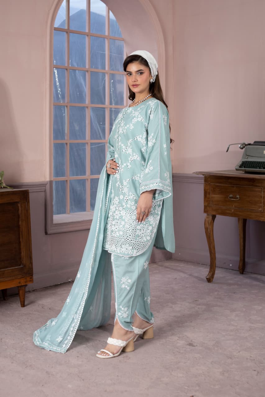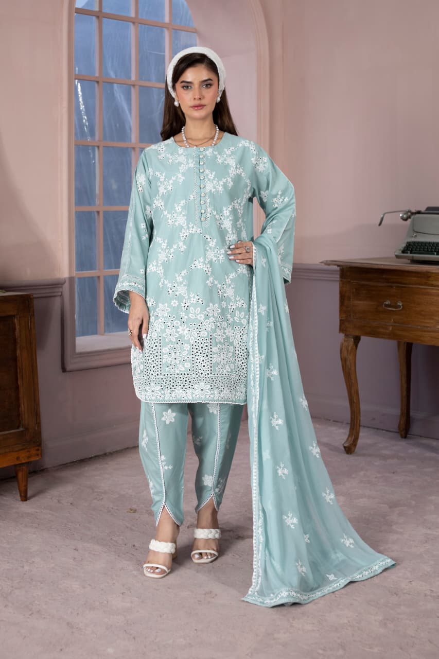 embroidered 3 piece cotton suit with short shirt stitched summer collectionEmbroidered 3 Piece Cotton Suit With Short Shirt -STITCHED- Summer Collection