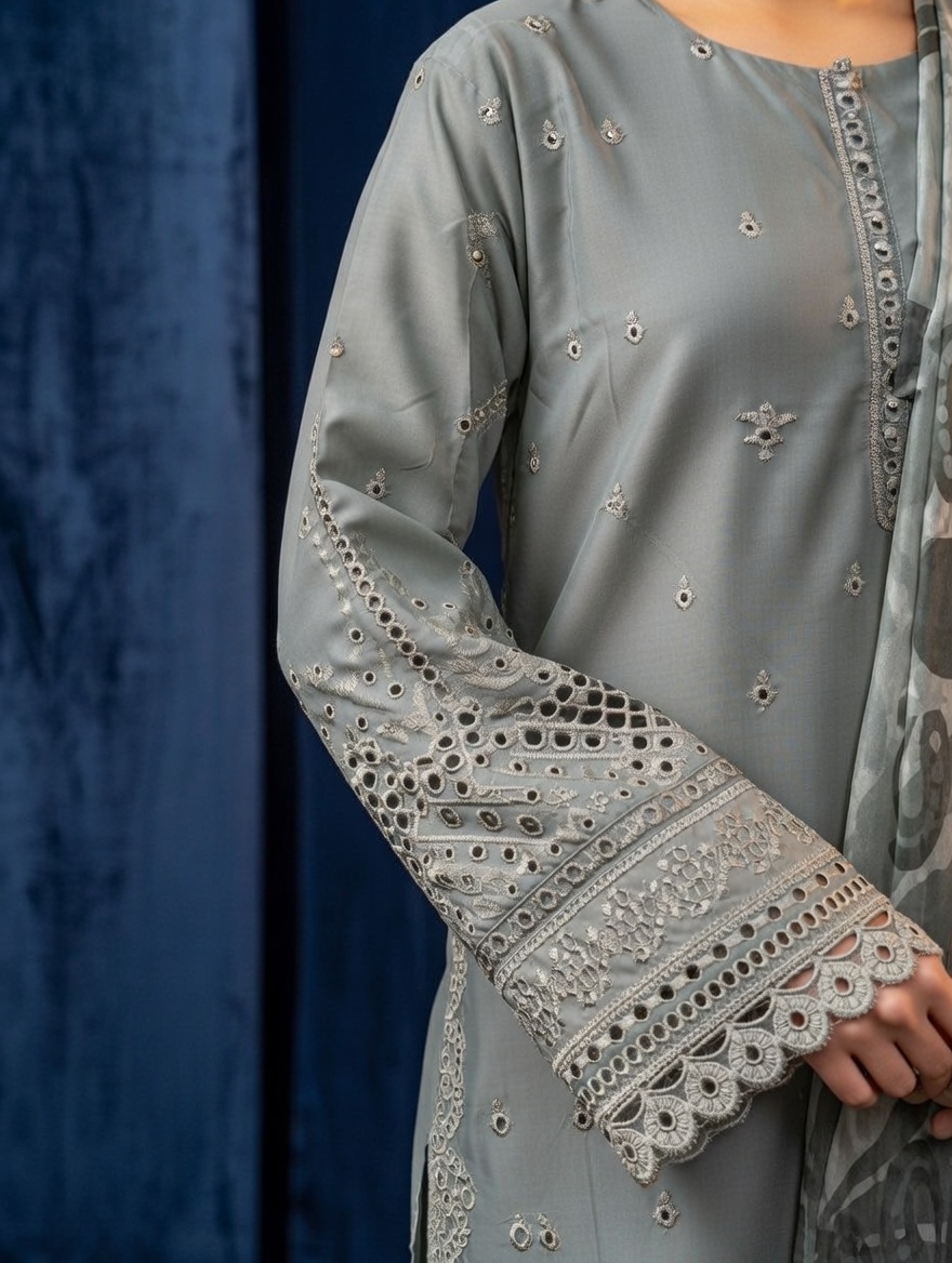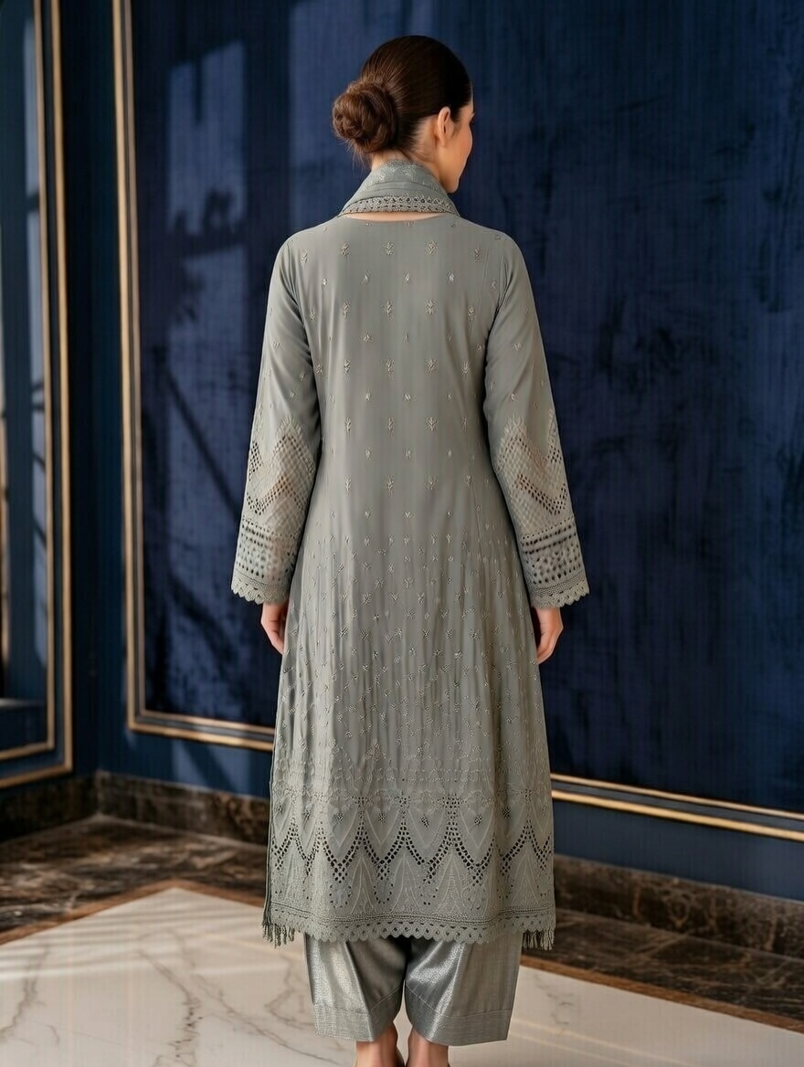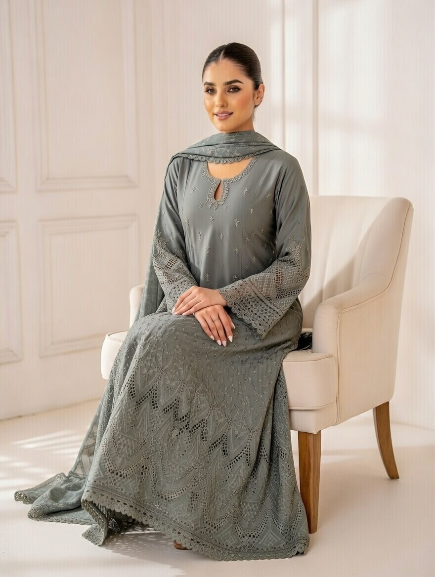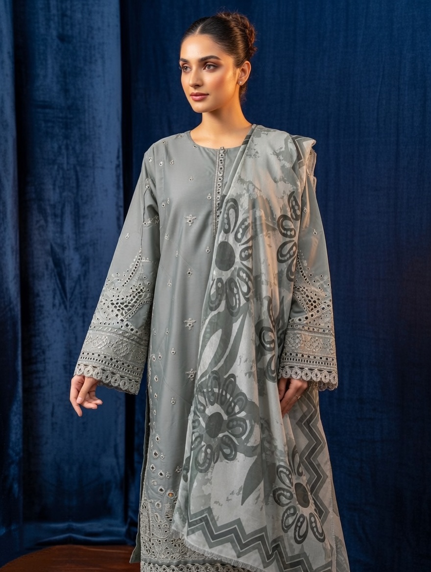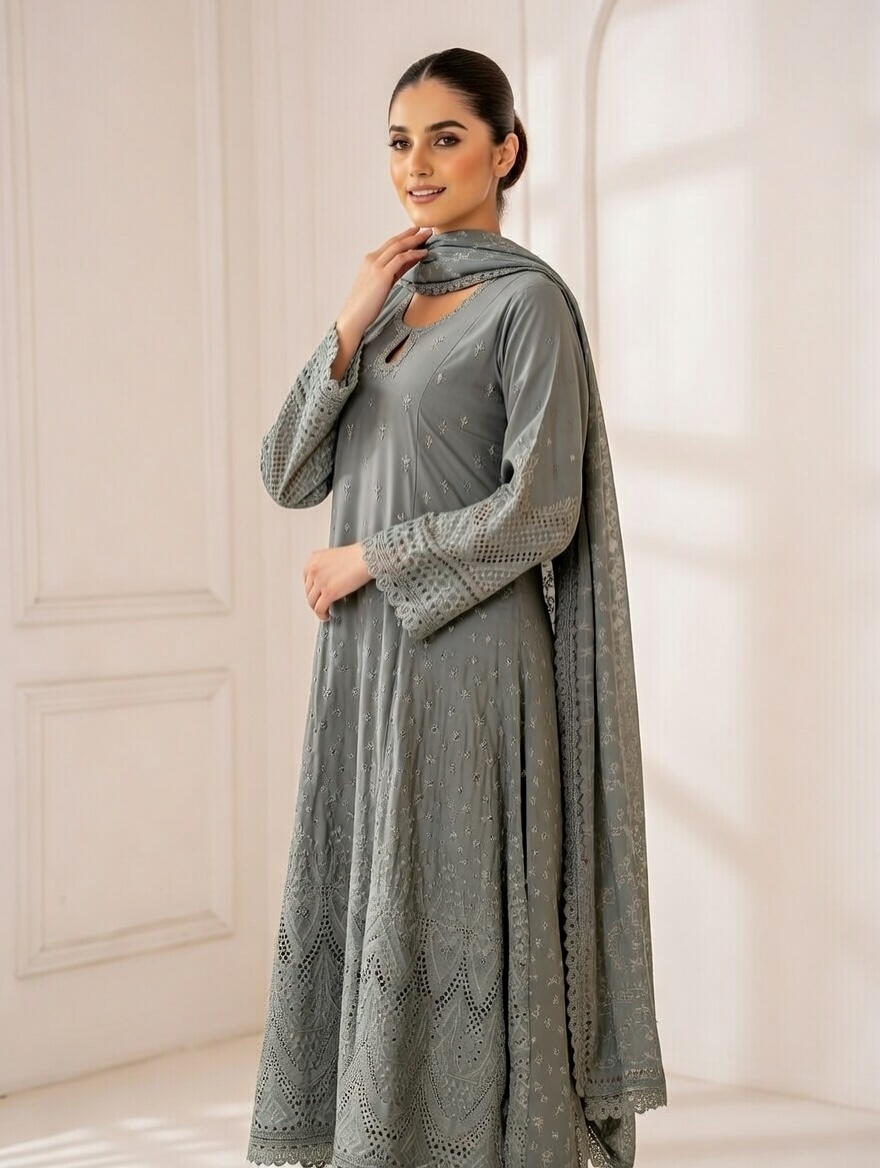 Embroidered Cotton Lawn Frock with printed Dupatta and stitched Trouser