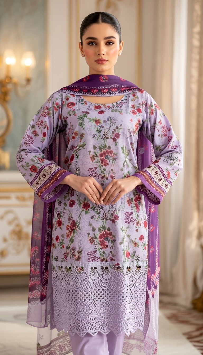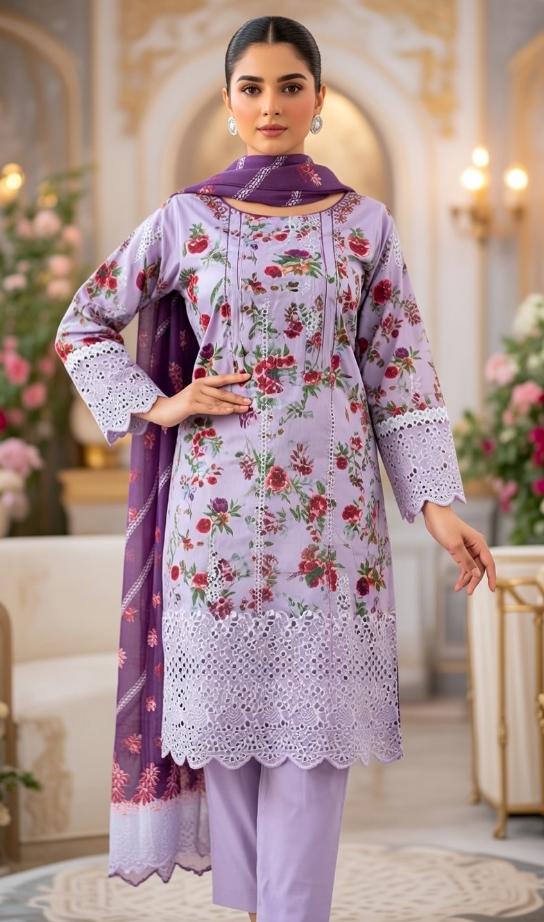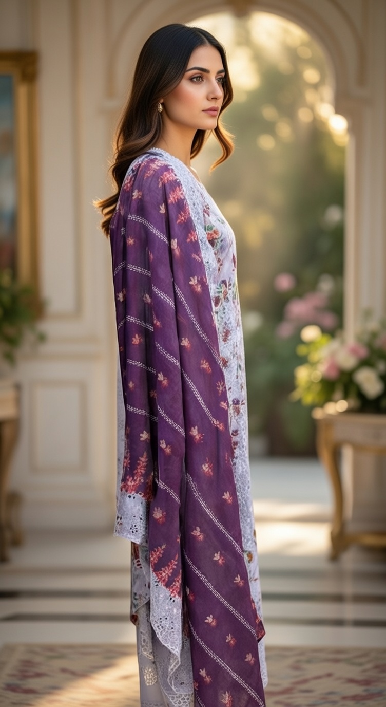 Embroidered Khaddar Shirt with Print Dupatta and Plain Trouser